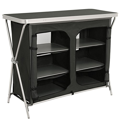 - PRAKTISCH | Mit den vielen Ablageflächen und Stauräumen bietet der Camping Faltschrank genügend Stauraum für Ihre Kochutensilien und Vorräte. Auf der großen Arbeitsfläche lassen sich die verschiedensten Gerichte einfach vor- und zubereiten.